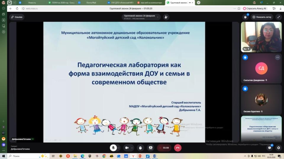 Добрынина Татьяна Александровна, и.о. заведующего МАДОУ «Могойтуйский детский сад «Колокольчик» раскрыла новую форму с родителями «Педагогическая лаборатория как форма взаимодействия ДОУ и семьи в обществе».
