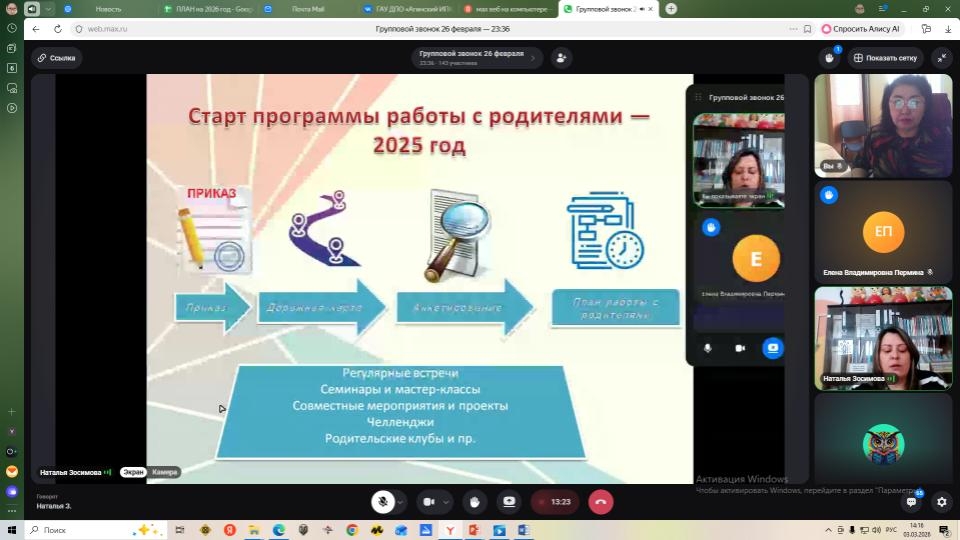 В выступлении Зосимовой Натальи Александровны, старшего воспитателя МДОУ «Новоорловский центр развития ребенка – детский сад «Аленушка» Агинского муниципального округа была представлена система форм работы с родителями в ДОО: от информирования к партнерству.