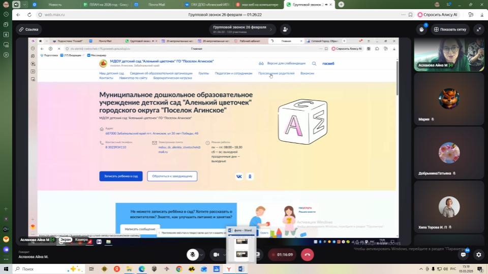 Сегодня состоялся вебинар, собравший более 150 педагогов дошкольного образования сетевых методических округов Забайкальского края Юго-Западный и Южный-2: ГО «Поселок Агинское», Агинский, Дульдургинский, Могойтуйский, Акшинский, Ононский и Кыринский муниципальные округа.