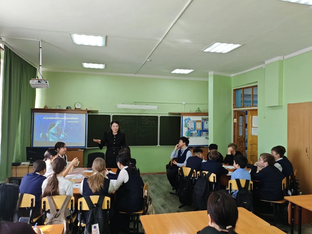 Урок математики провела учитель МОУ “АСОШ №3” ГО “Пос. Агинское” Дашижамсоева Балжин Цыреновна. Тема: «Случайные события». Учащиеся 7 Б класса вместе с педагогом разбирались в том, что такое вероятность и как случайность влияет на нашу жизнь.