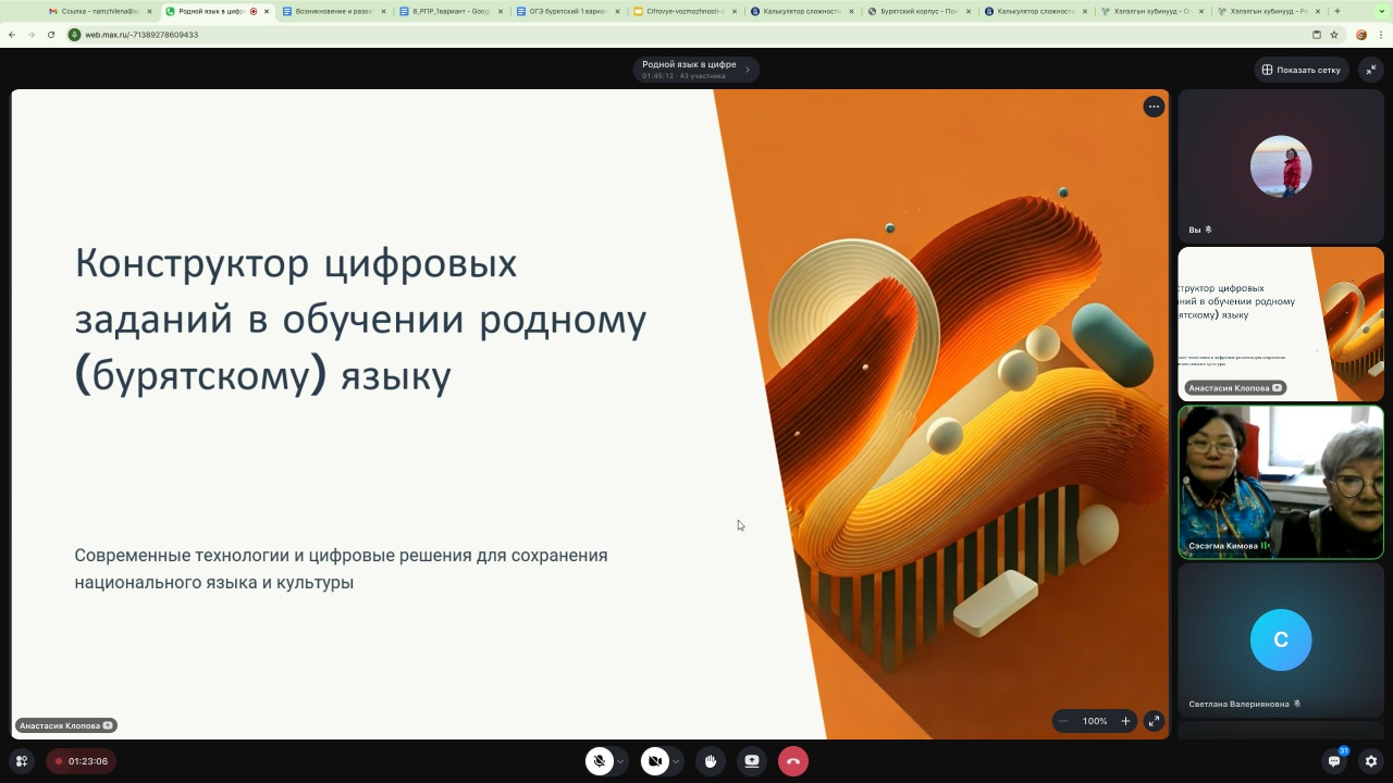 В рамках конференции проведен научно-методический семинар «Родной язык в цифре», модераторы Светлана Зандараевна Кимова, канд. пед. наук, доцент, зав. кафедрой воспитания и дополнительного образования ГУ ДПО «ИРО Забайкальского края», Римма Аюровна Махабадарова, канд. пед. наук, старший преподаватель ИРО Забайкальского края, Дулмажаб Дугаржаповна Цынгуева, канд. культурологии, старший преподаватель ГАУ ДПО «Агинский ИПК». В работе семинара в очном и онлайн форматах приняли участие более 50 человек.